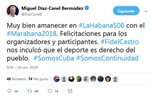 «Muy bien amanecer en #LaHabana500 con el #Marabana2018. Felicitaciones para los organizadores y participantes. #FidelCastro nos inculcó que el deporte es derecho del pueblo. #SomosCuba #SomosContinuidad», dijo el mandatario en su cuenta en Twitter. VER MÁS
