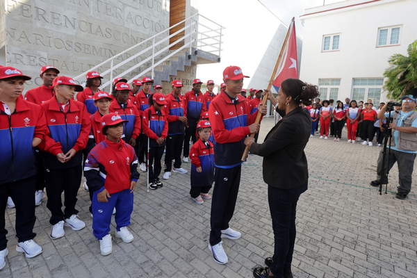 Enrique Cepeda, multicampeón paralímpico de paratletismo, puso la bandera cubana en manos de Yuneidis Imbert Chaple, vicejefa del departamento de atención al sector social del Comité Central, quien la entregó a Jorge Massaguer, de paratenis de mesa, abanderado de la delegación y escoltado por Diana Rosa Urgellés de paranatación e Ivanna Rodríguez, también de paratenis de mesa.