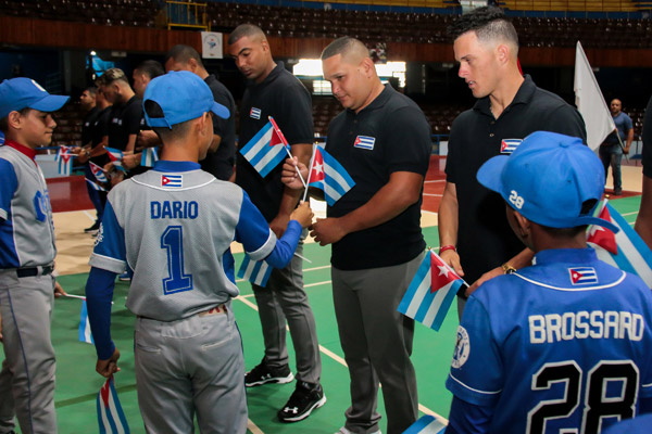 Varios peloteros de equipos infantiles capitalinos le entregaron a los miembros de la preselección ejemplares de nuestra enseña nacional como reafirmación de la continuidad del deporte más seguido en la Isla.