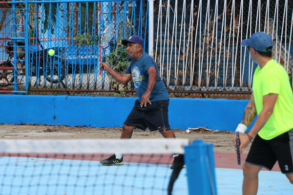 Junto a Roberto Cruz, presidente de la asociación de veteranos del tenis, Chay elogia lo bonita que quedó la cancha tras el remozamiento general de que es objeto la Ciudad Deportiva. Nos apoyaron en la pintura de las canchas y las gradas, también con el cercado, apunta sonriente.
