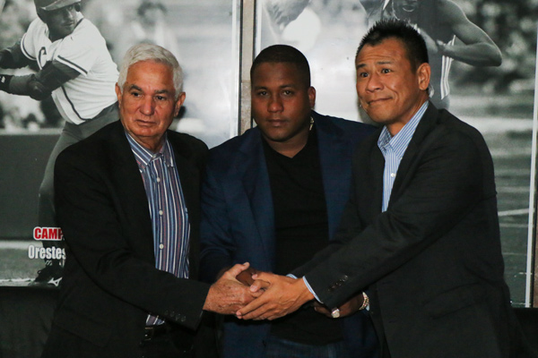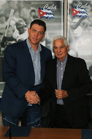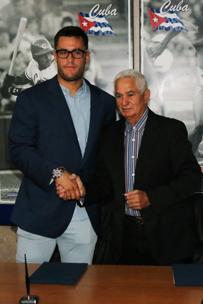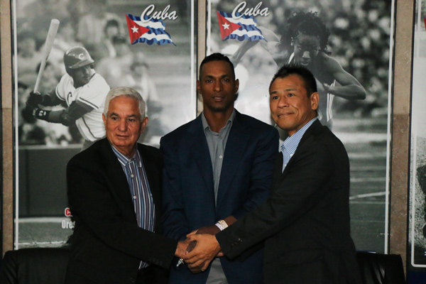 En el lobby del Coliseo de la Ciudad Deportiva capitalina rubricaron contratos además los jugadores de posición Alfredo Despaigne y el más valioso de la temporada precedente Yurisbel Gracial, ambos con los campeones vigentes de los Halcones de Softbank.