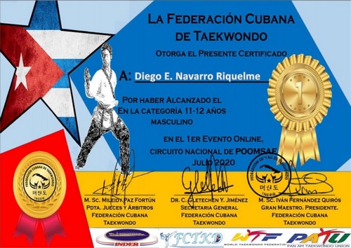 La Habana.- DIEGO Enrique Navarro y Andrea Sophia Herrera Rodríguez ganaron la categoría pioneril en el I Circuito Virtual Nacional de Poomsae, inaugurado hoy con la participación de taekwondocas de todas las provincias, excepto de Mayabeque y Pinar del Río.