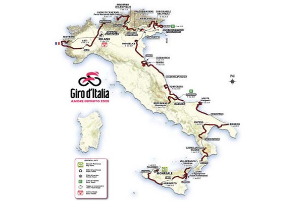Las primeras cuatro etapas de la carrera, cuya largada estaba prevista originalmente en Hungría, se disputará en el municipio de Monreale, al norte de Sicilia, precisaron los responsables de la prueba, que contará con tres tramos contrarreloj y siete metas en ascensos, seis de ellas en alta montaña.