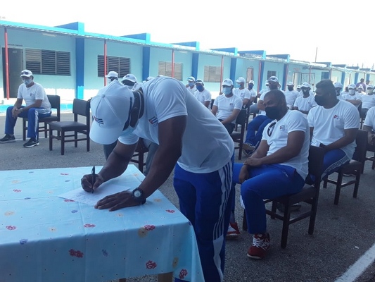 Los atletas Vladimir García, Raúl González, Yorbis Borroto, Osvaldo Vázquez y Liomil González, en representación de sus compañeros, firmaron el código de compromiso para la Serie que se inicia el 12 de septiembre.