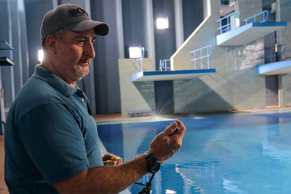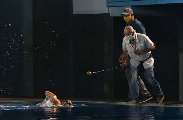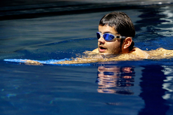 Pérez e Izquierdo aprovechan la tan necesaria cálida temperatura en la pileta de 25 metros del Complejo Deportivo Vicente Quesada, de Bayamo, aledaña al hotel Sierra Maestra en que se hospedan.