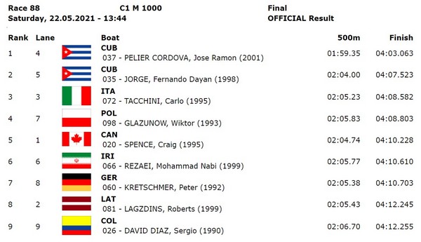 Similar proeza a la de Yarisleidis estampó José Ramón Pelier (4:03.063) en la canoa individual (C-1) a mil metros, en puja con su compatriota Fernando Dayán Jorge (4:07.523) y el italiano Carlo Tacchini (04:08.582).