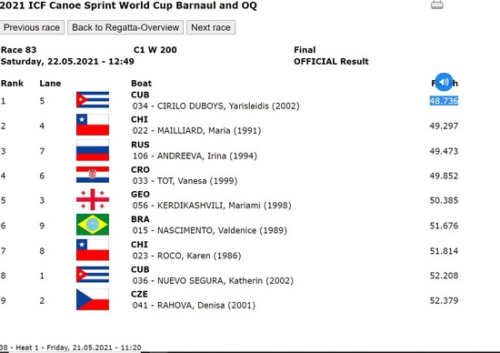 Como bólido entró a la meta la guantanamera Cirilo en la canoa individual (C-1) a 200 metros, al marcar 48.736 segundos para relegar a la segunda posición a la chilena María Mailliard (49.297) y a la tercera a la rusa Irina Andreeva (49.473)