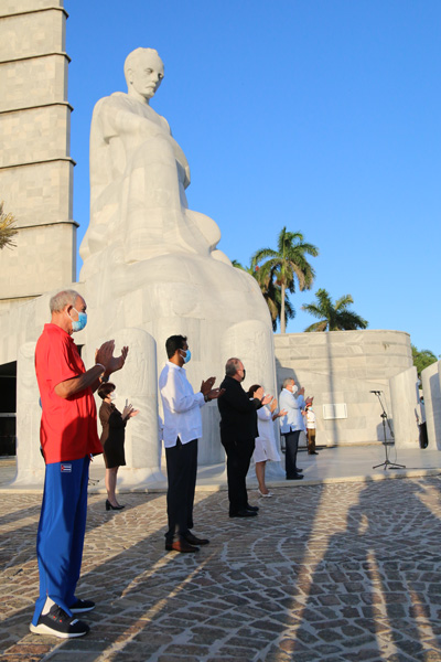 Al pie del Monumento a José Martí, en la Plaza de la Revolución, Marrero entregó la enseña patria a los multilaureados Omara Durand, de paratletismo, y Lorenzo Pérez, de paranatación, quienes estuvieron escoltados por Leonardo Díaz y Ángel Jiménez, también de paratletismo.
