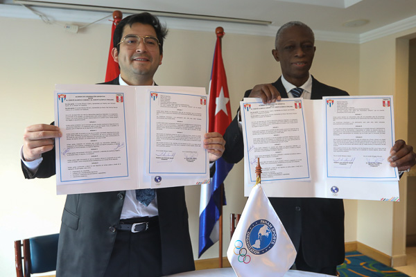 Roberto León Richards, presidente del Comité Olímpico Cubano (COC), y Renzo Manyari, su homólogo peruano (COP), rubricaron el documento en las oficinas de Panam Sports ubicadas en el Hotel Intercontinental, casa de los principales directivos asistentes a la cita caleña.