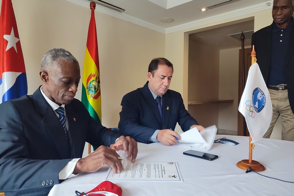 Roberto León Richards, presidente del Comité Olímpico Cubano (COC), y Marco Arze Mendoza, su homólogo boliviano (COB), rubricaron el documento en las oficinas de Panam Sports ubicadas en el Hotel Intercontinental, casa de los principales directivos asistentes a la cita multideportiva caleña.