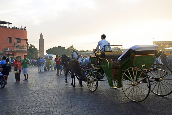 En la plaza Jamaa el-Fna, desde cuya altísima torre se llama a la oración, el encanto pasa por los carruajes tradicionales tirados por caballos que convocan al paseo y la música del mercado llega a tornarse ensordecedora.