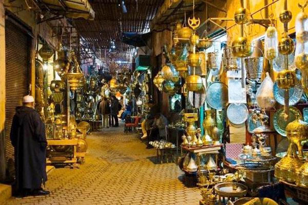 Cada espacio es inundado por hermosas lámparas metálicas que semejan un fino encaje, alfombras de todos los tamaños y colores, cestos tejidos de palma, tradicionales babuchas (zapatos descalzados) y miles de diseños para las chilabas (túnica con capucha de los hombres) y caftanes (vestidos de las mujeres con adornos tejidos).
