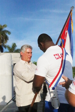 En las afueras del Memorial José Martí el también primer vicepresidente de los Consejos de Estado y de Ministros entregó la enseña nacional al luchador bicampeón olímpico Mijaín López y la badmintonista Darianni Hurtado.