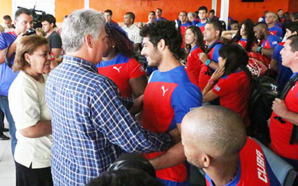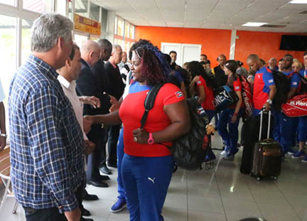 «Felicidades y triunfen por la Patria, los recibiremos con mucho honor», añadió en el encuentro vivido en la Terminal 5 del aeropuerto internacional José Martí y presidido por el miembro del Buró Político Miguel Díaz-Canel Bermúdez.