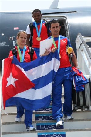 La Habana.- CONTENTOS y orgullosos con sus medallas colgadas y la enseña nacional entre sus manos, descendieron del avión los tiradores Eglys de la Cruz y Reynier Estopiñán, quienes lideraron el cuarto grupo de 123 atletas arribado hoy tras competir en los XVII Juegos Panamericanos de Toronto.