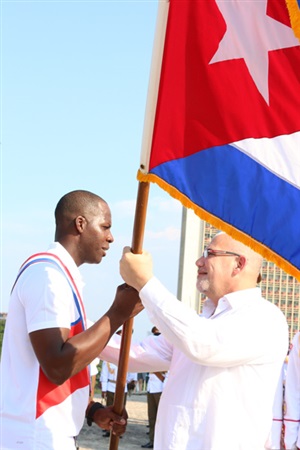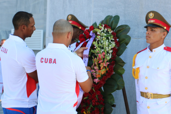 Becali puso el estandarte en manos de Rudy Reyes, quien fue escoltado por Yulieski Gurriel y Liván Moinello poco después que Yorbis Borroto y Yurisbel Gracial depositaran una ofrenda floral en homenaje al Maestro.