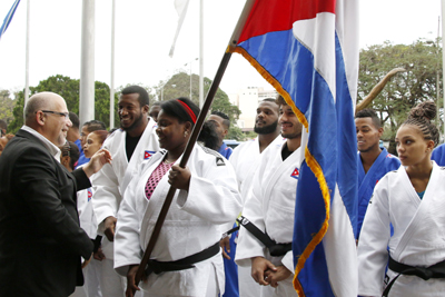 El presidente del INDER, Dr. C. Antonio Becali, entregó la enseña nacional a Ortiz, campeona olímpica de Londres 2012, escoltada por González, titular del orbe en Río de Janeiro 2013, y José Armenteros, plata del mundial de Chelíabinsk 2014.