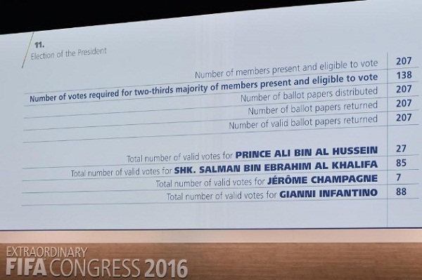 En la segunda vuelta de las votaciones el suizo de origen italiano logró 115 votos, por delante del Sheik Salman Bin Ebrahim Al Khalifa con 88 y el príncipe Alí Bin Al Hussein con 4 tras el conteo de 207 participantes.