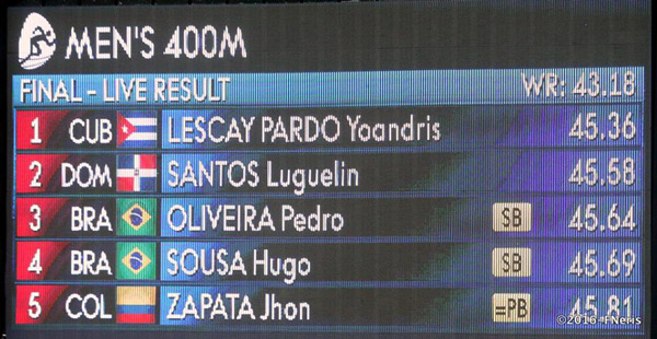 Luguelín terminó segundo con 45.58 y el siguiente escaño quedó en manos del local Pedro Oliveira con 45,64. Cuba dependió además de Williams Collazo, séptimo con 45.92.