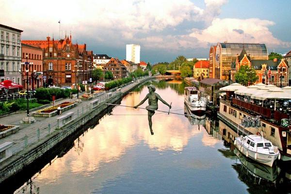 Otro símbolo que se roba la atención del visitante es la estatua del equilibrista que cuelga sobre una cuerda de acero sustentada de un lado a otro del río Brda.