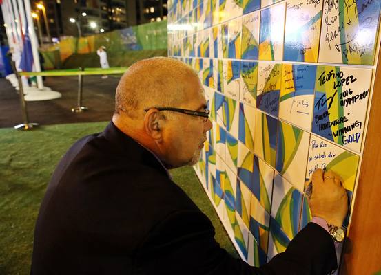 “Para Río un saludo del pueblo cubano”, escribió el Dr. Antonio Becali, presidente del INDER, antes de firmar la losa de cerámica asignada a su delegación en el mural instalado en la zona internacional de la villa.