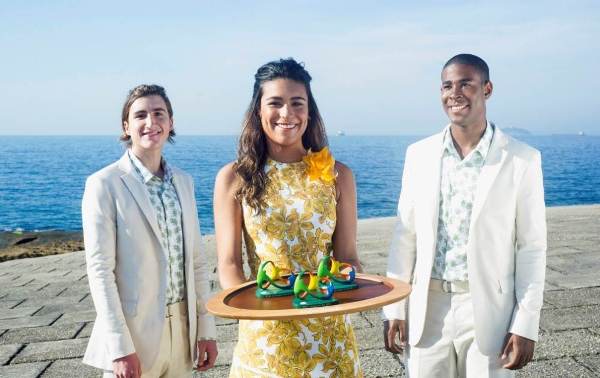 Las camisas de los hombres y los vestidos de las mujeres tienen motivos florales típicamente brasileños, integrados en un concepto de elegancia tropical remarcado por la creadora.