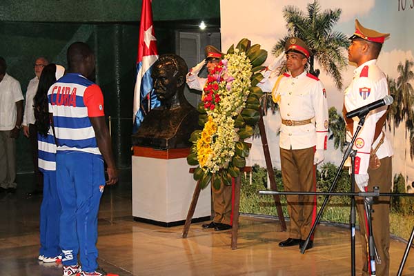 En el inicio la velocista Yunidis Castillo, cinco veces dorada en esas lides, y el judoca Jorge Hierrezuelo, medallista de oro en Londres 2012, depositaron una ofrenda floral ante la efigie del Héroe Nacional.