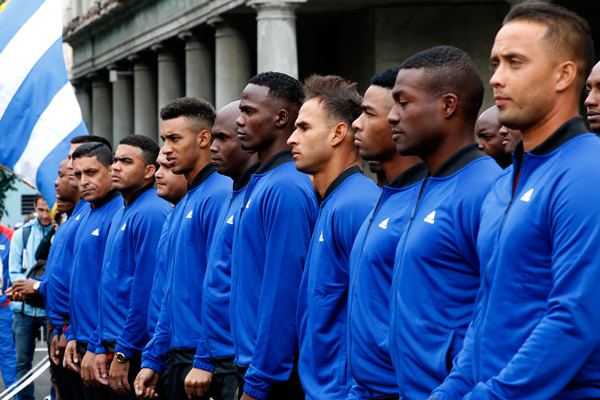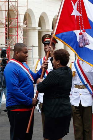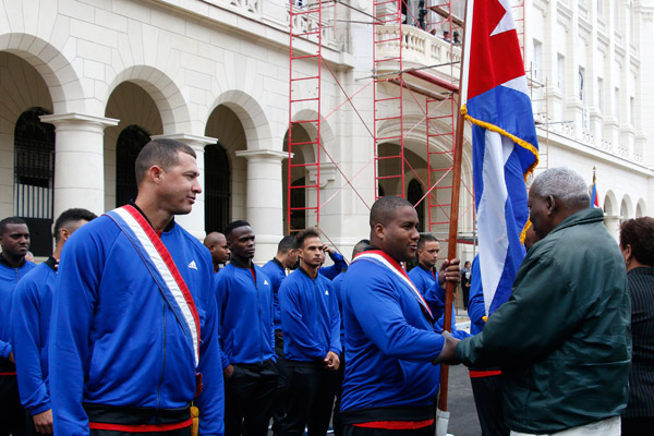 En el habanero Memorial Granma, Olga Lidia Tapia Iglesias, miembro del Secretariado y jefa del Departamento de Educación, Deportes y Ciencia del Comité Central del Partido, entregó la enseña patria al jonronero Alfredo Despaigne, quien estuvo escoltado por los lanzadores derechos Lázaro Blanco y Miguel Lahera.