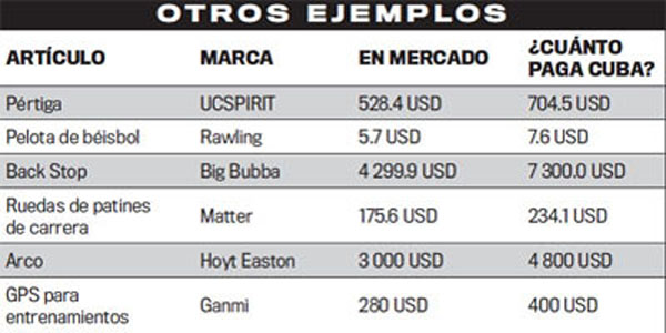 - Un bate de béisbol que vale 140.00 USD en Estados Unidos cuesta a Cuba 185.00 USD, como los spikes que cualquier otra nación compra en 58.00 USD en ese país demandan a Cuba 129.00 USD.