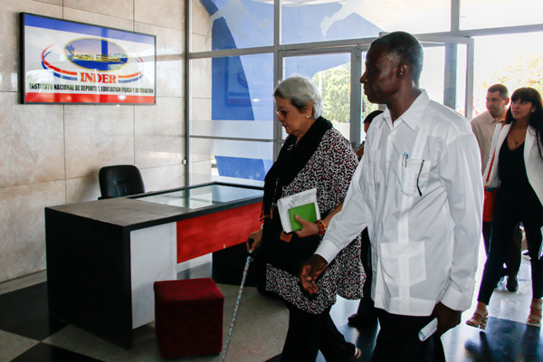 El directivo aguardó a la distinguida visitante en la entrada principal del organismo, donde le expresó la satisfacción por acogerla y el saludo en nombre del presidente, Dr.C. Antonio Becali Garrido, y de los restantes representantes del movimiento deportivo cubano.