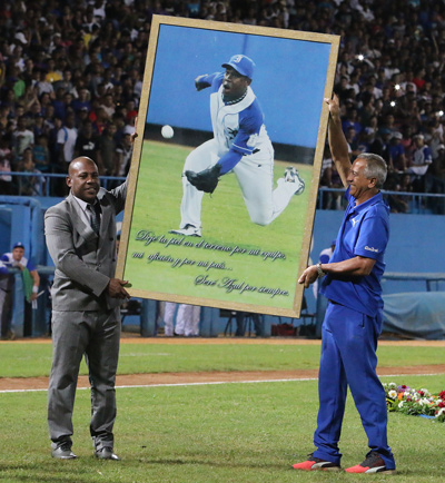 El público aplaudía, grababa, sentía… Una obra plástica del artista Michel Mirabal lo esperaba justo donde clavó sus spikes cada día, durante 25 temporadas, para defender a su equipo, a su país, a su gente.