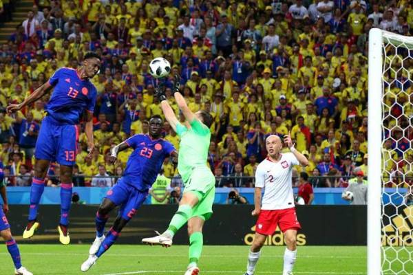 Así llegó el gol de Mina al minuto 40, tras un centro milimétrico de James Rodríguez desde las afueras del área polaca por el sector derecho.