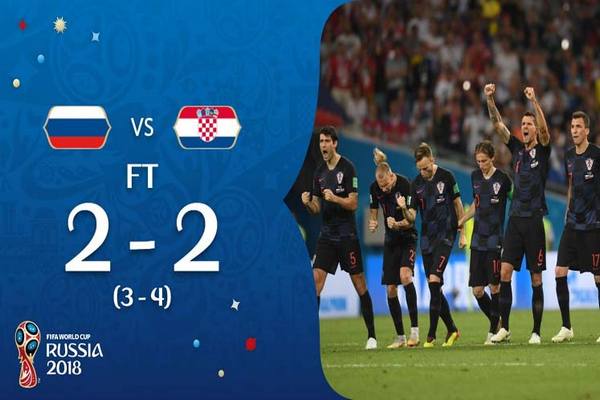Rusia entró con más fuerza en la prórroga. En el minuto 100 tras un saque de esquina de Modric el zaguero Domagoj Vida remató de cabeza y puso en ventaja Croacia. Los dueños de casa no se amilanaron y en el 114 empataron. Mario Fernández brasileño nacionalizado ruso acuñó el festejo con la testa.