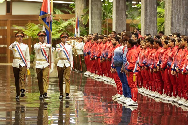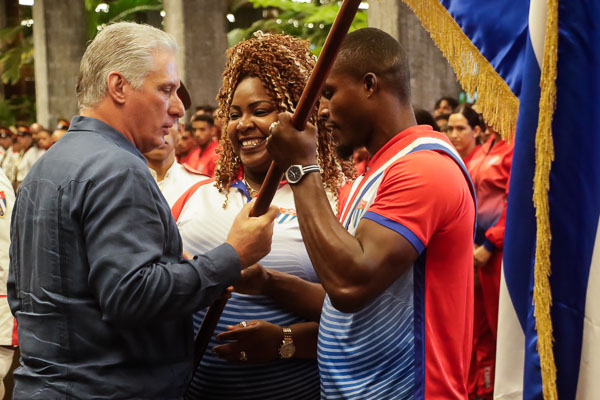El Presidente Díaz-Canel hizo entrega de la gloriosa enseña nacional a Idalys Ortiz Bocourt, multimedallista olímpica, panamericana y centrocaribeña de judo; y a Julio César La Cruz Peraza, bicampeón olímpico, multicampeón panamericano y centrocaribeño, y cinco veces campeón mundial de boxeo. Ambos jóvenes estuvieron escoltados por otros dos compatriotas llenos de méritos: Luis Alberto Orta Sánchez, medallista de oro olímpico y centrocaribeño, y bronce panamericano de lucha greco; así como Yilian Rondón Velázquez, subcampeona centrocaribeña y medallista de bronce panamericano y campeona de los V Juegos del Alba.