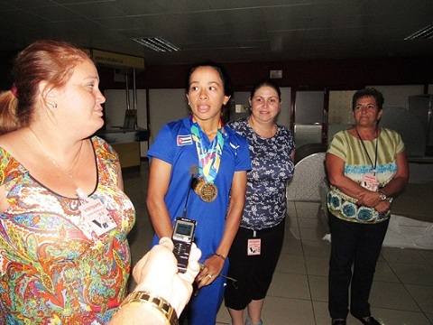 Por Víctor Vitaliano Báez Sánchez La Habana–LAS TRICAMPEONAS del ciclismo femenino en los XXIII Juegos Centroamericanos y del Caribe, Arlenis Sierra y Marlies Mejías, a su llegada a la patria ratificaron que ese deporte cumplió con el compromiso de aportar medallas de oro a la delegación cubana. En el recibimiento oficial realizado en el Aeropuerto Internacional José Martí, Marlies, expresó que querían aportar más, pero por las circunstancias de las carreras en su momento no se pudo y agregó, «estoy satisfecha por el trabajo que se realizó en equipo, creo que fue bastante amplio y cumplimos con el objetivo que teníamos con nuestro deporte y como lo esperaba nuestro pueblo» Por su parte Arlenis Sierra, en declaraciones a Jit, ratificó sentirse orgullosa por haber tenido la posibilidad de aportar la primera medalla de oro a la delegación cubana en la cita multideportiva. «La actuación de cada una de las mujeres y de los hombres durante las competencias, fue luchar hasta el final y así obtener los mejores resultados», destacó la granmense de 25 años de edad. En las palabras de bienvenida la funcionaria del Instituto Nacional de Deportes, Educación Física y Recreación, Gisleidy Sosa, significó, «ustedes han demostrado la estirpe de los cubanos, de patriotas y de los valores de estos tiempos demostrados por nuestros atletas y colectivo técnico durante el evento». Al concluir el acto de recibimiento a la delegación cubana de ciclismo que participó en la justa centrocaribeña, la miembro del puesto de dirección del INDER, Angelina Notó, le entregó al equipo el cuadro que lo califica como Colectivo de la Dignidad.