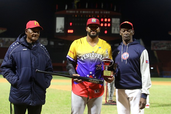 El miembro del elenco de Venezuela que participa en el certamen beisbolero recibió el trofeo que lo acreditó como ganador de manos de los otrora estelares peloteros cubanos Wilfredo Sánchez y Lázaro Junco.