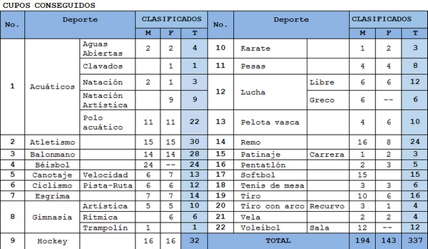 Los cupos se distribuyen en 22 deportes, con atletismo (30), remo (24), lucha (18), gimnasia (17), tiro (16) y esgrima (14) como los de mayor presencia entre los individuales.